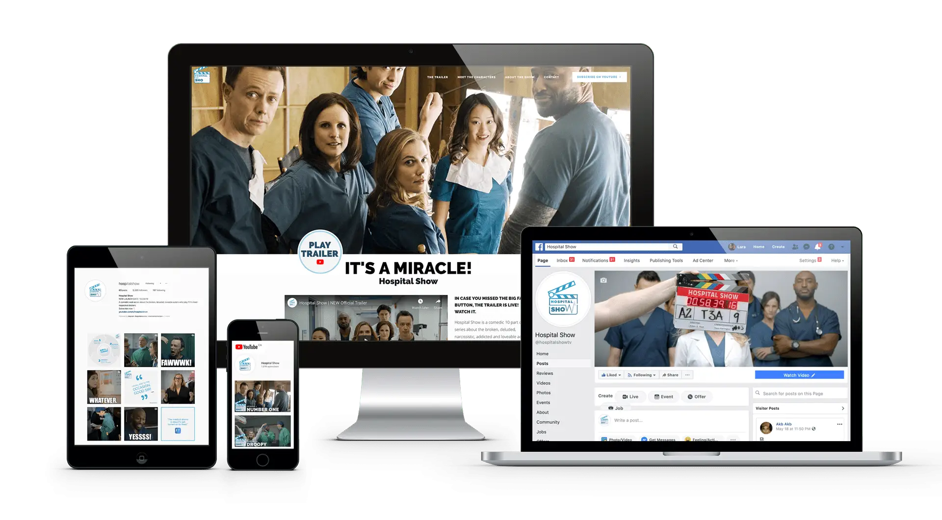 Hospital Show, a comedic digital series of ten episodes, offers a satirical look at the lives of actors portraying TV’s most revered doctors. These characters, despite their flaws—ranging from narcissism to addiction—are incredibly endearing to viewers. Lara Kroeker Interactive and Forge and Spark was tasked with encapsulating the essence of this unique series into its digital footprint.